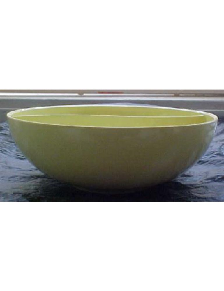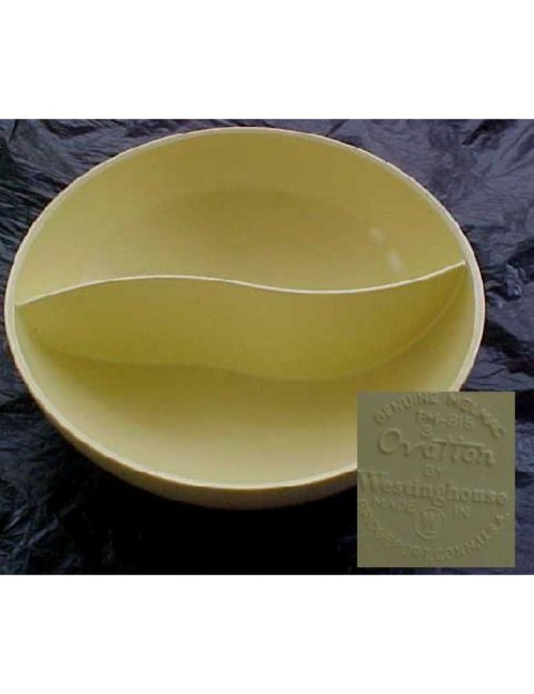 Vintage…Westinghouse… Genuine Melmac… 2-Part Divided Serving Bowl. Measures approximately 8 3/4″ wide x 3″ deep. Beautiful vintage divided melamine/melmac sunshine yellow divided serving bowl. Marked on the bottom “Genuine Melmac..PM-815-3…Ovation by Westinghouse…Made in Bridgeport, Conn., USA”. No chips or cracks. 1 small “dink” at the very bottom (seen photo). In good, used condition.